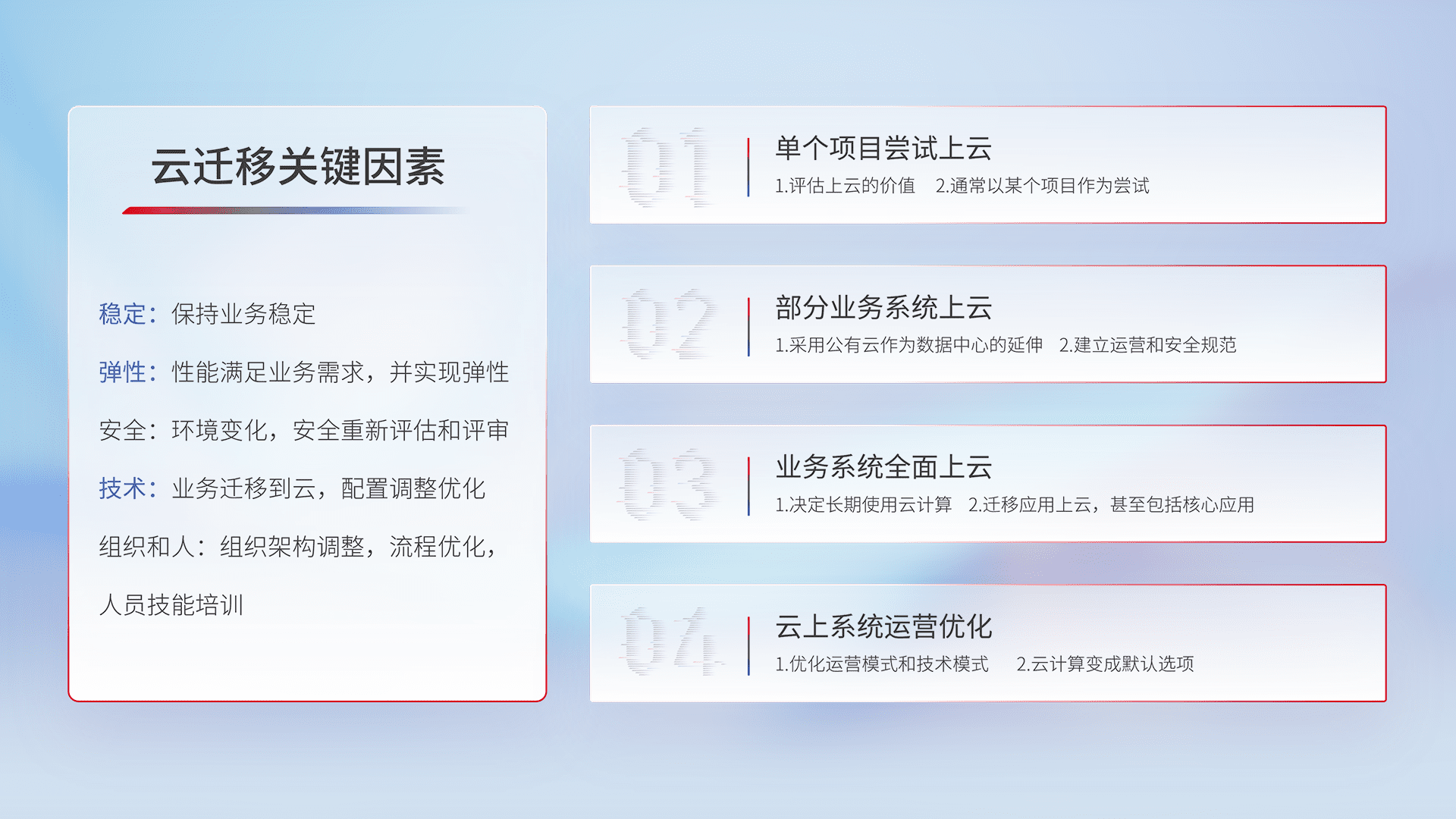 结合实际业务,,,,从规划设计、、、、云平台选型、、云原生改造、、、数据迁移、、、集成交付,,,,迁移全过程为客户识别最佳上云路径,,,做好风险识别管理,,,设计网络架构、、、、身份权限、、安全审计合规、、、、操作审计、、、日志审计、、、监控告警策略、、、、多站点容灾设计等,,,,对云上基础设施进行整体规划,,提升IT治理水平,,,,以满足弹性、、高可用、、、高性能的需求。。。