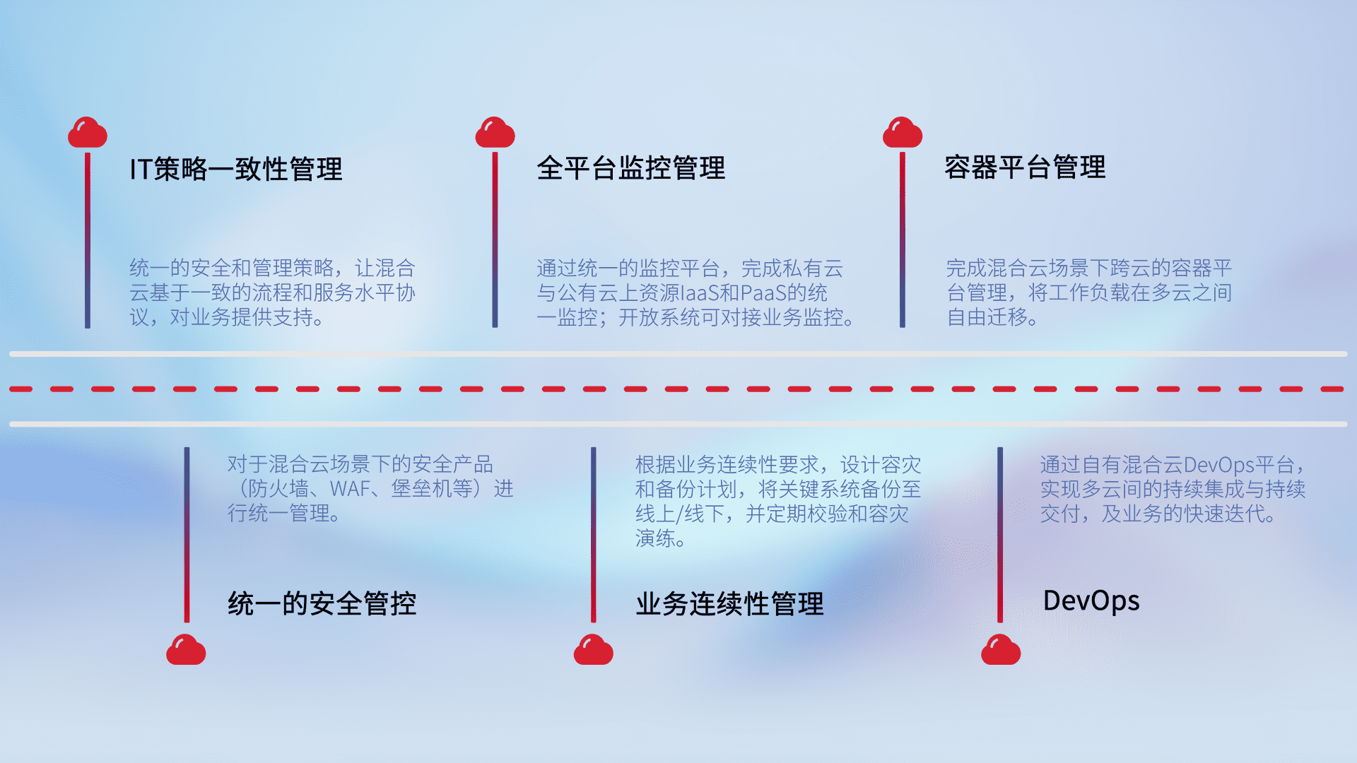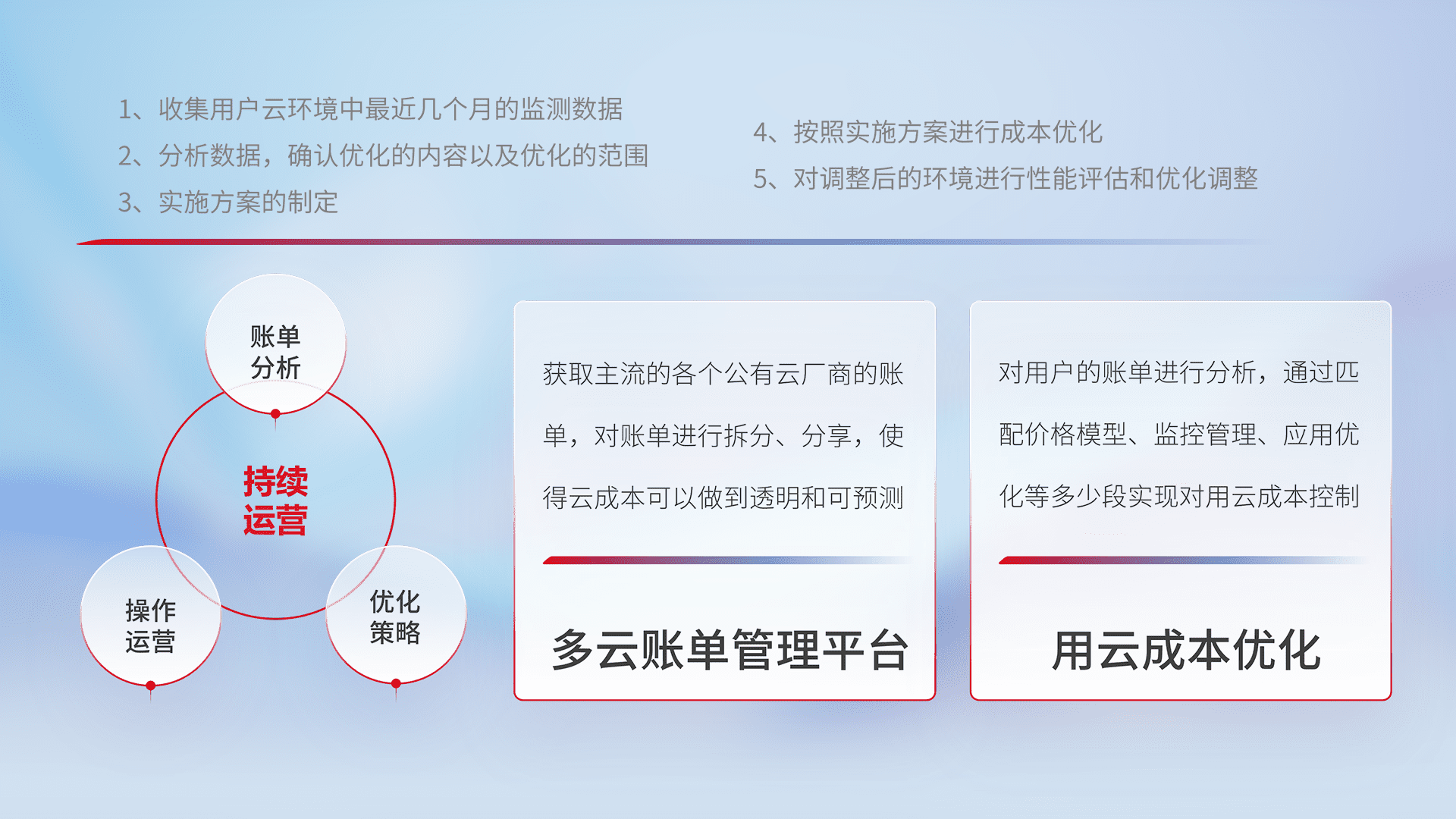 通过多云纳管,,,,以统一的资源数据模型把客户的云资源进行抽象和封装,,,进而实现对多云资源的统一操作,,保障云资源管理的可靠性、、、稳定性与可用性。。量身定制化运维内容,,,,配置、、、开发运维、、、、补丁管理、、、、备份、、、监控、、认证和访问管理、、审计和日常巡检等,,,,保障在用云过程中的可靠度,,,,稳定度以及高可用率。。。。