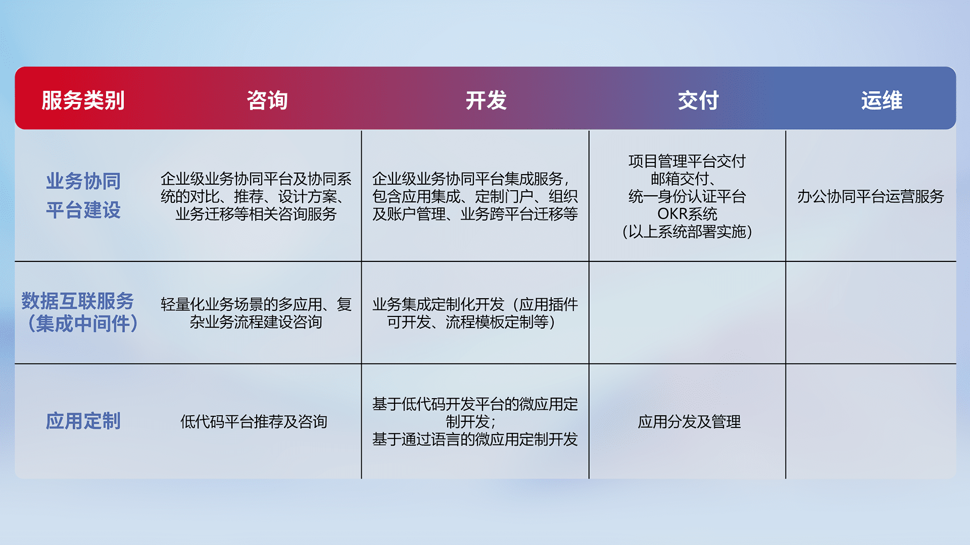 针对钉钉、、、企微、、、、IDaas等平台级产品提供产品的规划、、、方案、、交付、、定制化开发等服务,,,实现如统一协同办公、、、智能客户服务、、、、混合会议管理、、、智能数据查询、、等业务场景,,,实现数字化转型。。。。